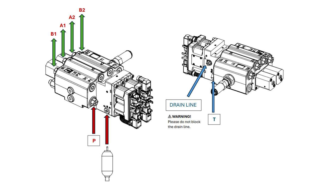 - Pokud jsou v hydraulickém okruhu dva ventily, připojte výstup přepínání prvního ventilu k tlakovému vstupu druhého ventilu.