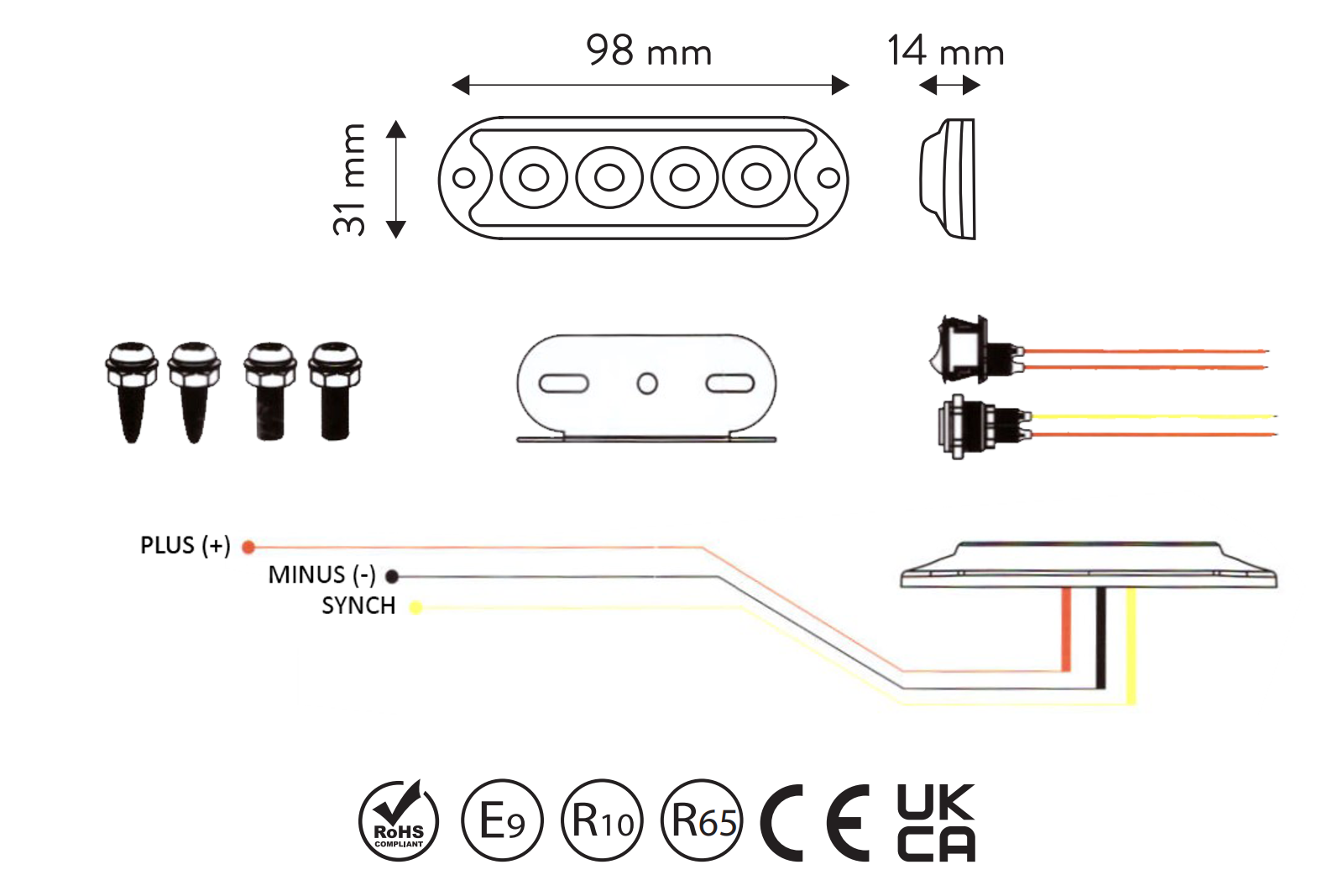 E9, R10, R65, CE, UKCA, ROHS |